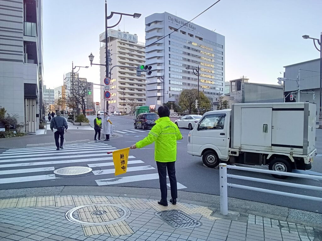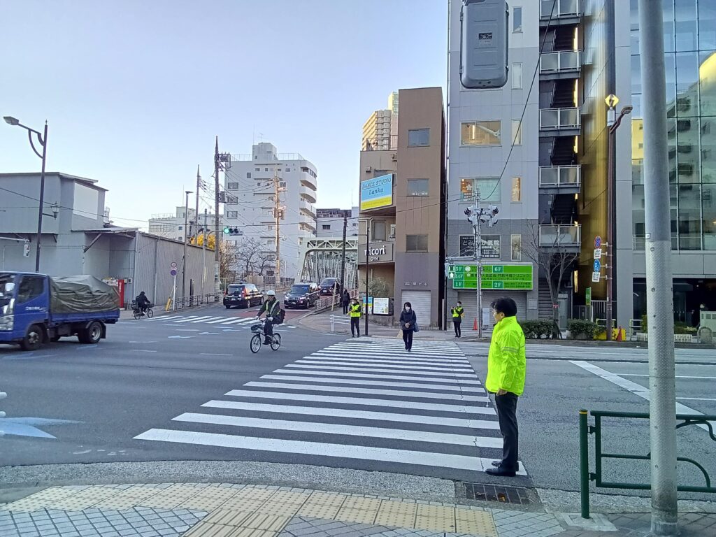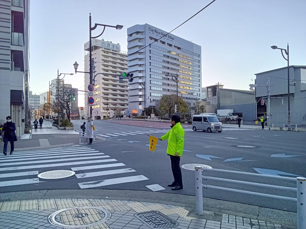 この活動は「交通安全運動」の一環として、毎月10日(今回は1月9日実施)東京都トラック協会深川支部主催の活動で、鎮目社長も参加し通年で続けているものです。子どもたちが安心して学校へ向かい、地域の皆さまが安全に一日を始められるよう、毎朝欠かさず取り組んでいます。